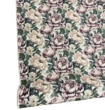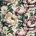 Stora blommor i en lummig trädgård, i lugna harmoniska färger. Blommorna är i ljuslila, ljusrosa och vita.